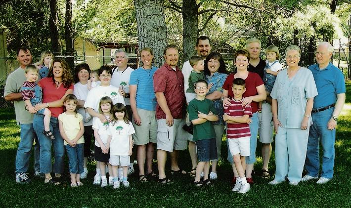 | My whole family. My mom and dad had five kids. They now have 11 grandkids. Can you guess who is a Muhlestein and who is an "in-law"? I love my family!!! (We are small compared to Tim's family... just wait until I post a Bliss photo! Tim's folks had 8 kids!) |